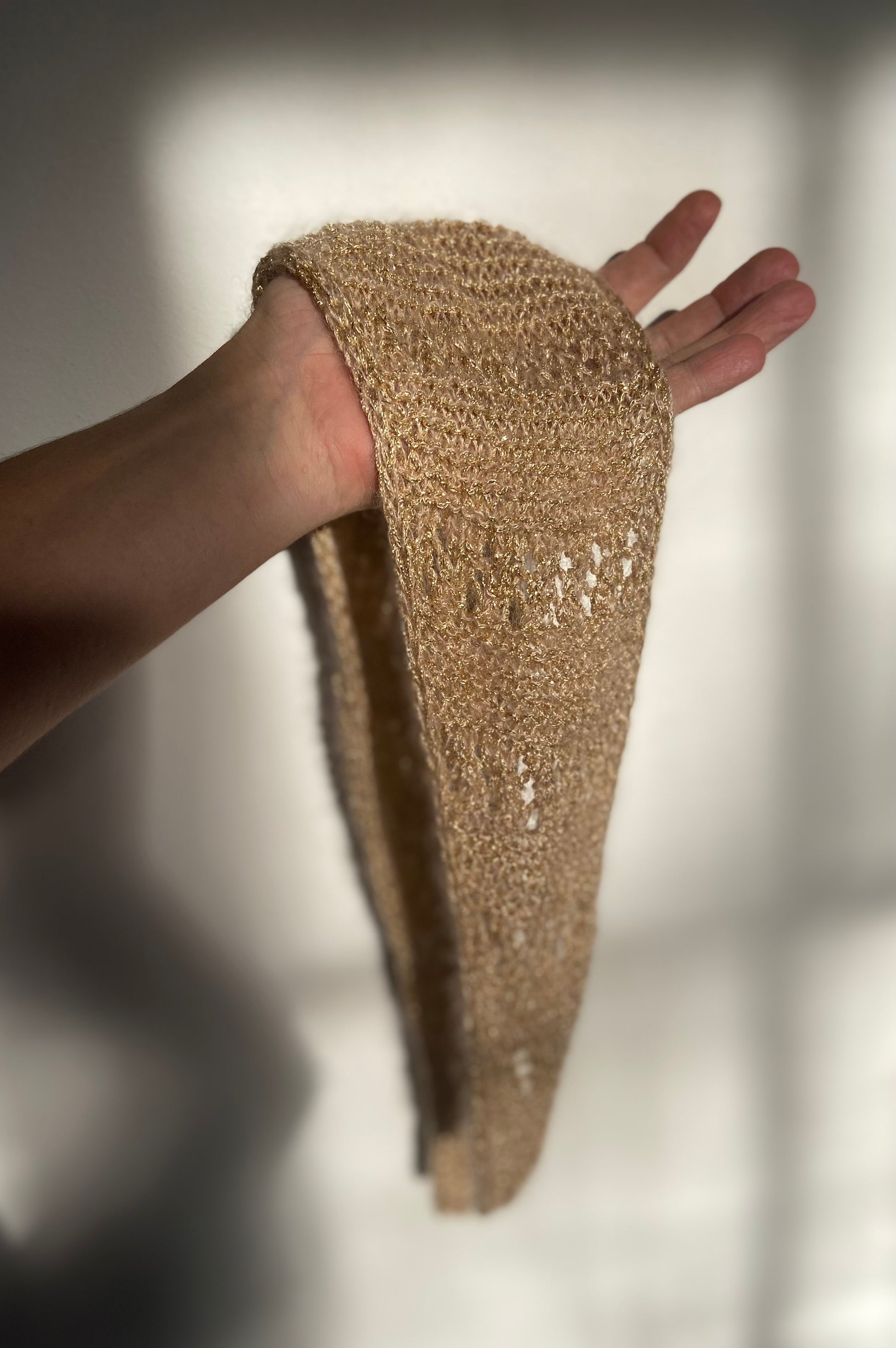 Det brune Air Vibe Scarf 1 med 6 retriller mellem hulmønster er strikket i 1 tråd Önling no 1 i farven Bolsana.