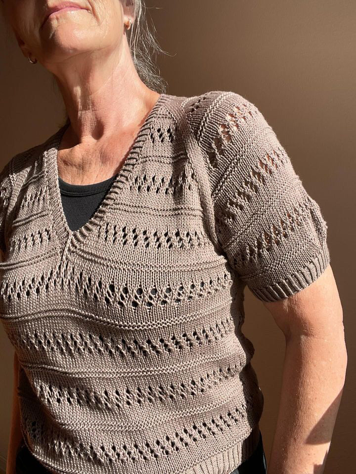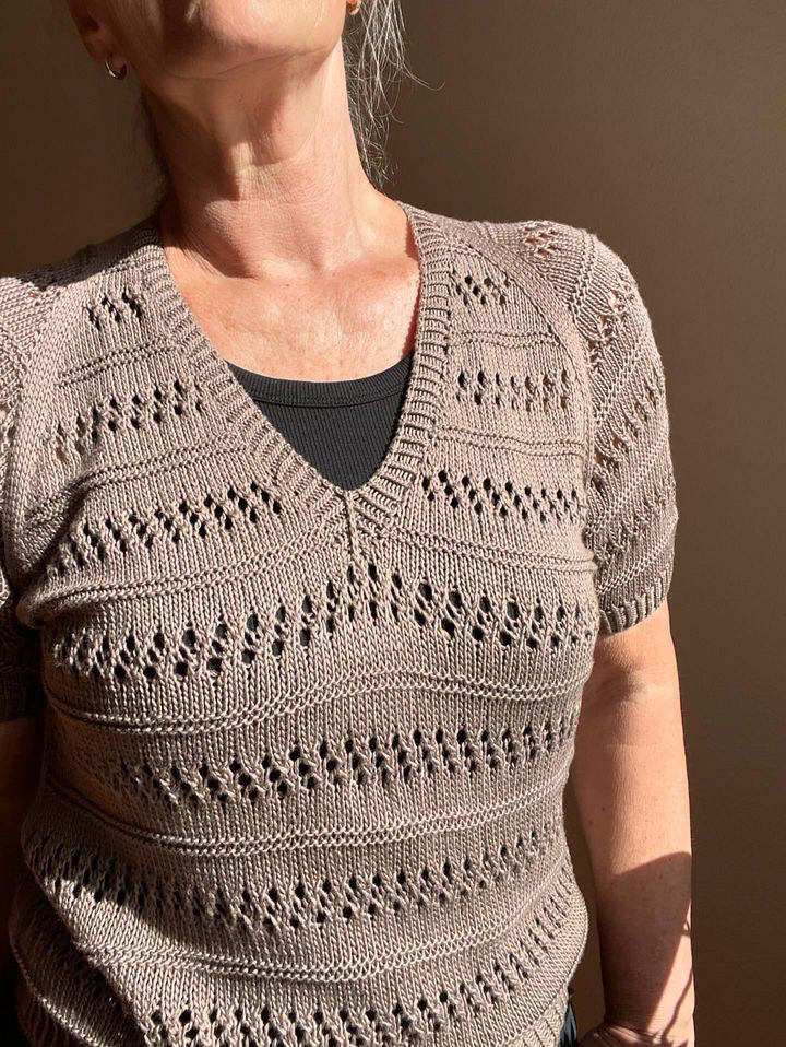 Beskrivelse av Air Vibe Tee Air Vibe Tee er strikket ovenfra og ned med raglanuttagninger, strukturstrikk og dyp V-hals. Strukturen formes med inntagninger, omslag og vrangmasker samt en glattstrikket stripe ned mellom raglanuttagningene. Den glattstrikkede stripen fra raglanuttagningene fortsetter ned langs hver side av kroppen og under ermene. Etter at bærestykket er strikket, deles det til ermer, og deretter strikkes kroppen og ermene rundt separat. Det strikkes strukturstrikk på både kroppen og ermene. Ermene prydes av et lite wienerlæg.