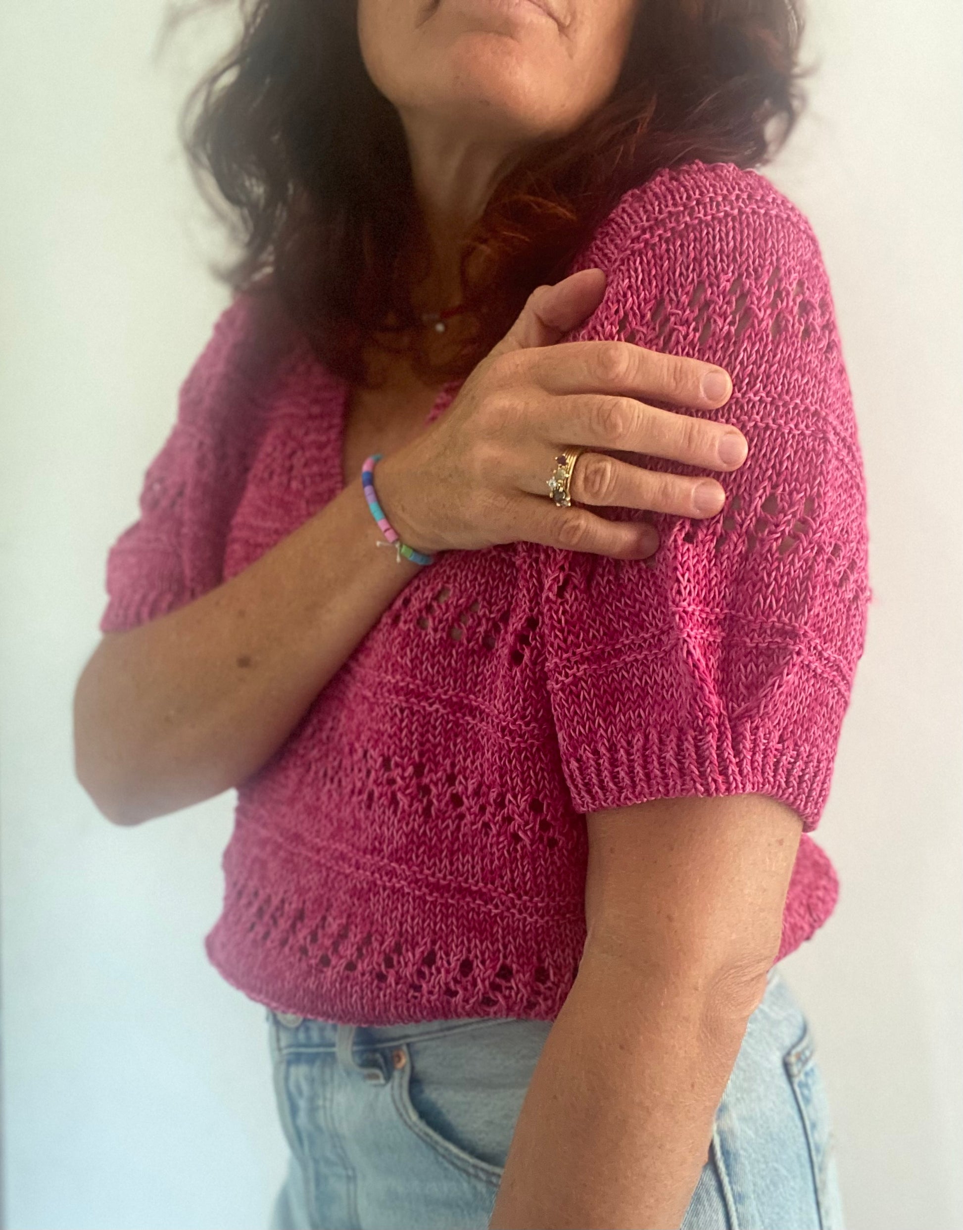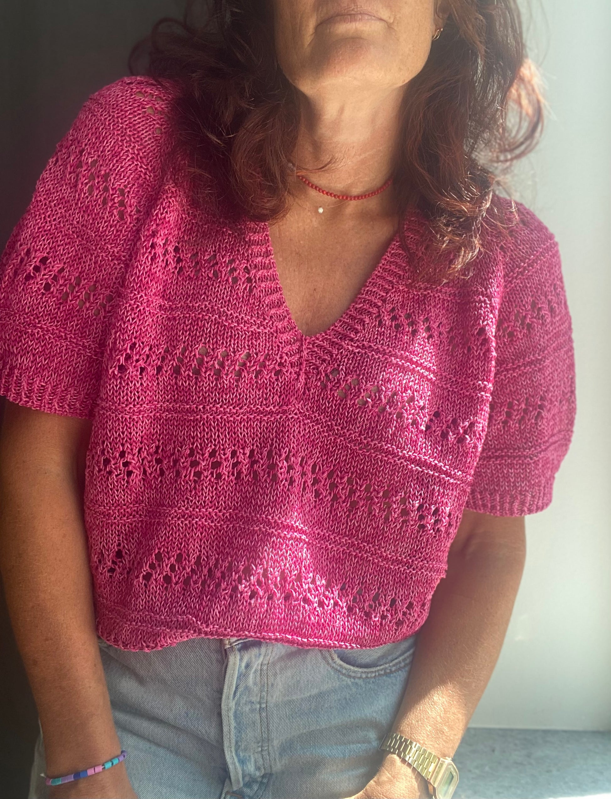 Air Vibe Tee kan strikkes med 1 eller 2 tråder. Det er 2 forskjellige garnalternativer:
