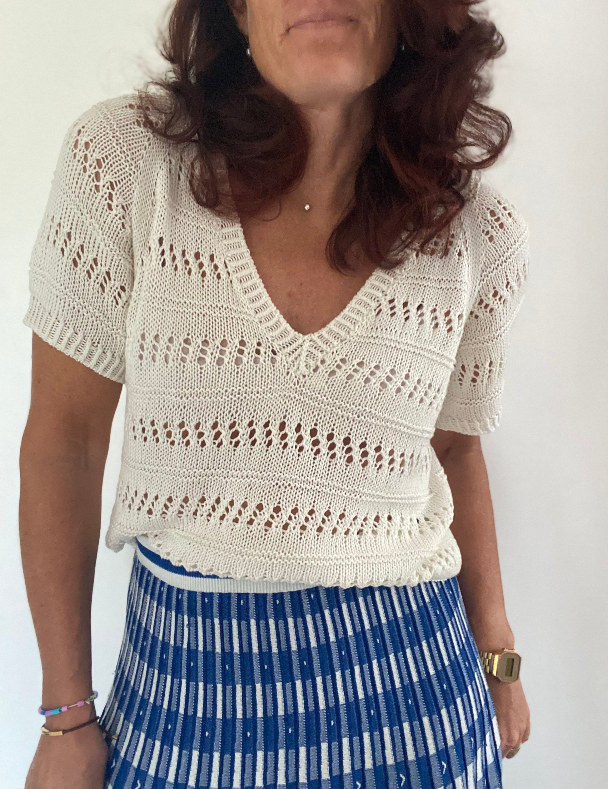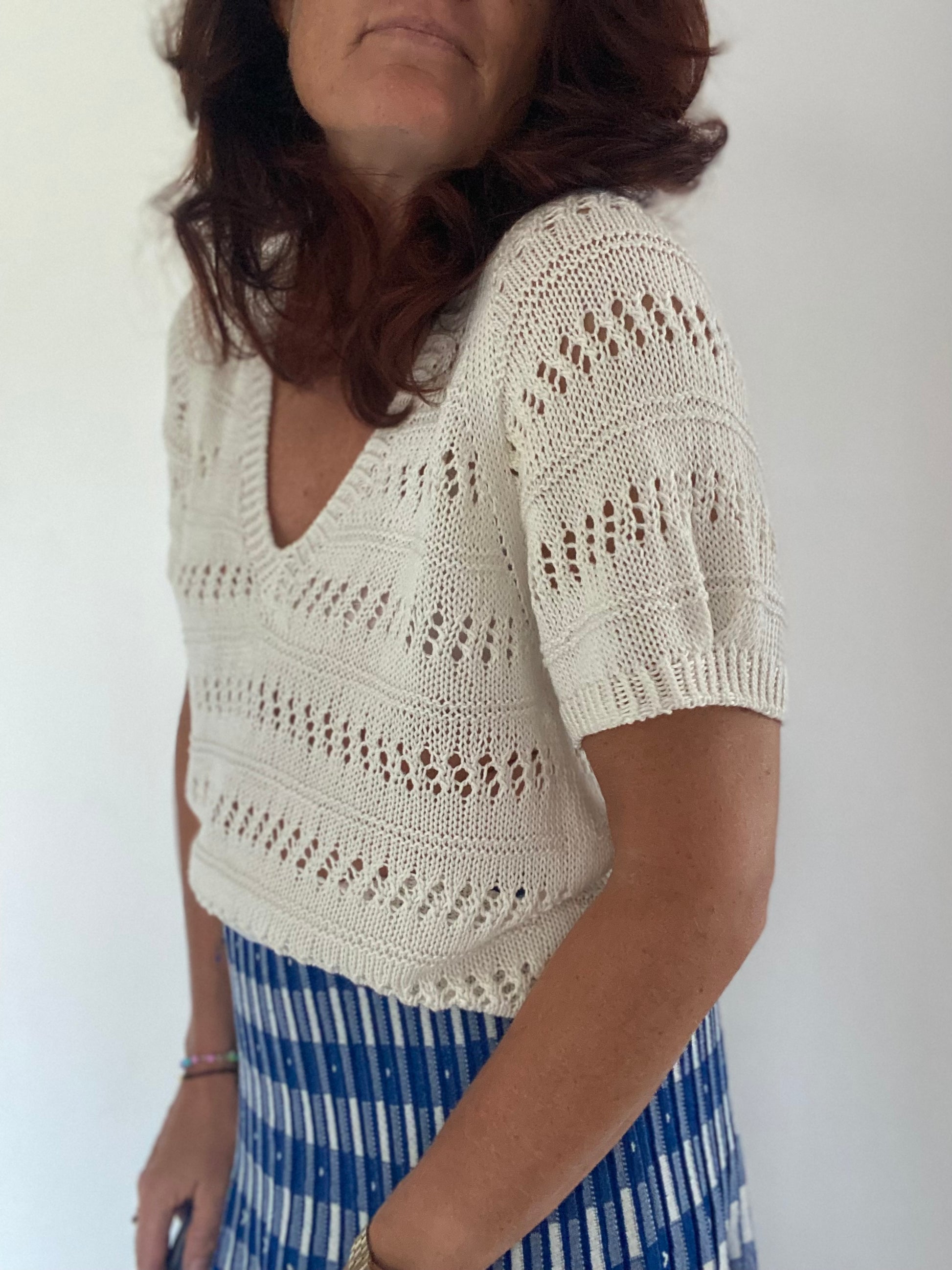 Strikkefasthet: 10 cm x 10 cm = 19 m x 28 p på pinne 4 mm i strukturmønster i garnvalget ditt ETTER VASK. Hullmønsteret og strukturen endrer seg etter vask. Derfor er det viktig at du vasker strikkeprøven din som du har tenkt å vaske den ferdige toppen, før du måler om strikkefastheten stemmer. Det er ikke viktig om du treffer strikkefastheten i høyden, da oppskriften tar høyde for at garnet kan variere i strikkefasthet i høyden.