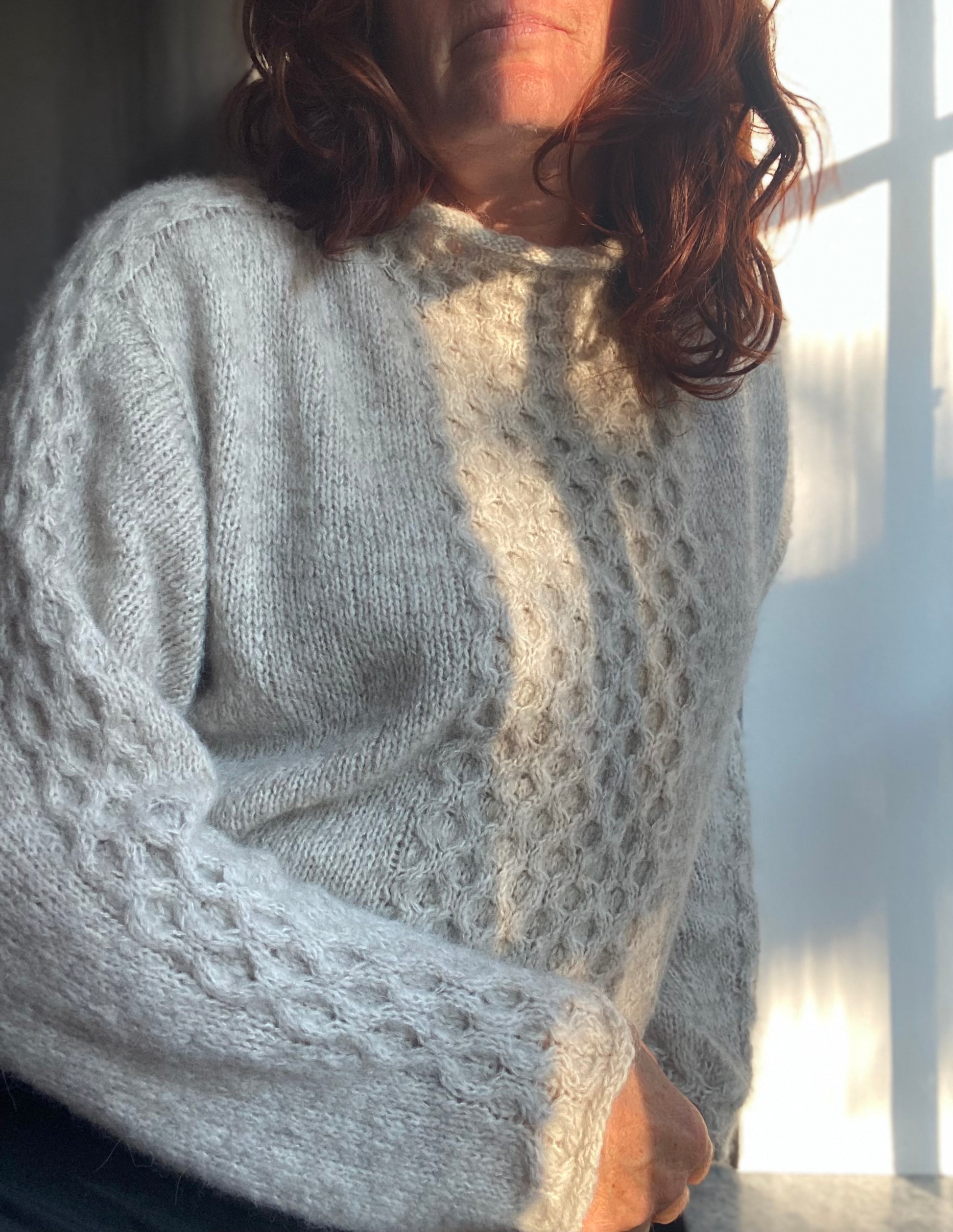 Bee Your Vibe Sweater is knitted from top to bottom with a honeycomb pattern, stockinette stitch and a saddle shoulder. The neck is standing and covered with the honeycomb pattern. After the neckline, the shoulders, front, and back piece are divided. The honeycomb pattern continues at the shoulders and down the chest. The sweater's shoulders are wider than the physical shoulder, giving an oversized look. Short rows are knitted to shape the neck and provide a good fit. After the shoulders and short rows are knitted, the body and sleeves are divided, after which the body and sleeves are knitted separately. The body is initially knitted as separated front and back pieces. After the armholes, the body is joined again and knitted in the round. Stitches are picked up for the sleeves, which are then knitted in the round with the honeycomb pattern and stockinette stitch. Both the body and sleeves are finished with I-cord edges.