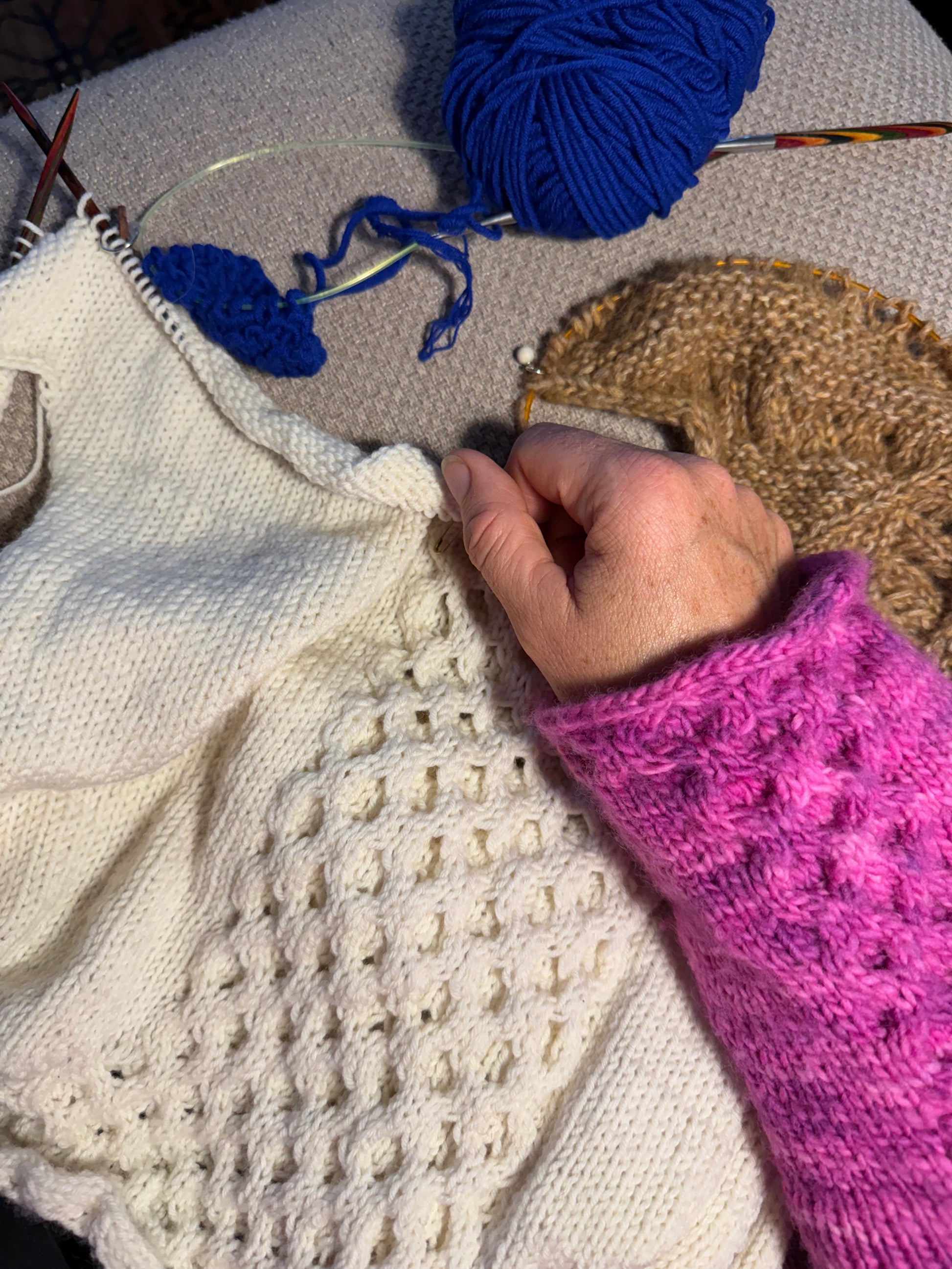Bee Your Vibe Sweater is knit with a combination of a honeycomb pattern and stockinette stitch, which do not have the same gauge before wash. This means, that the sweater will be winkled at the shoulders and neck after increases. After washing, when the honeycomb pattern has opened up, the winkles will straighten up and the gauge will be closer. However, there will still be a difference between the large honeycomb panels at the front and sleeves and the stockinette stitch sections. The honeycomb pattern at the top of the shoulders can be shaped when the sweater is wet, hence all the folds disappear.