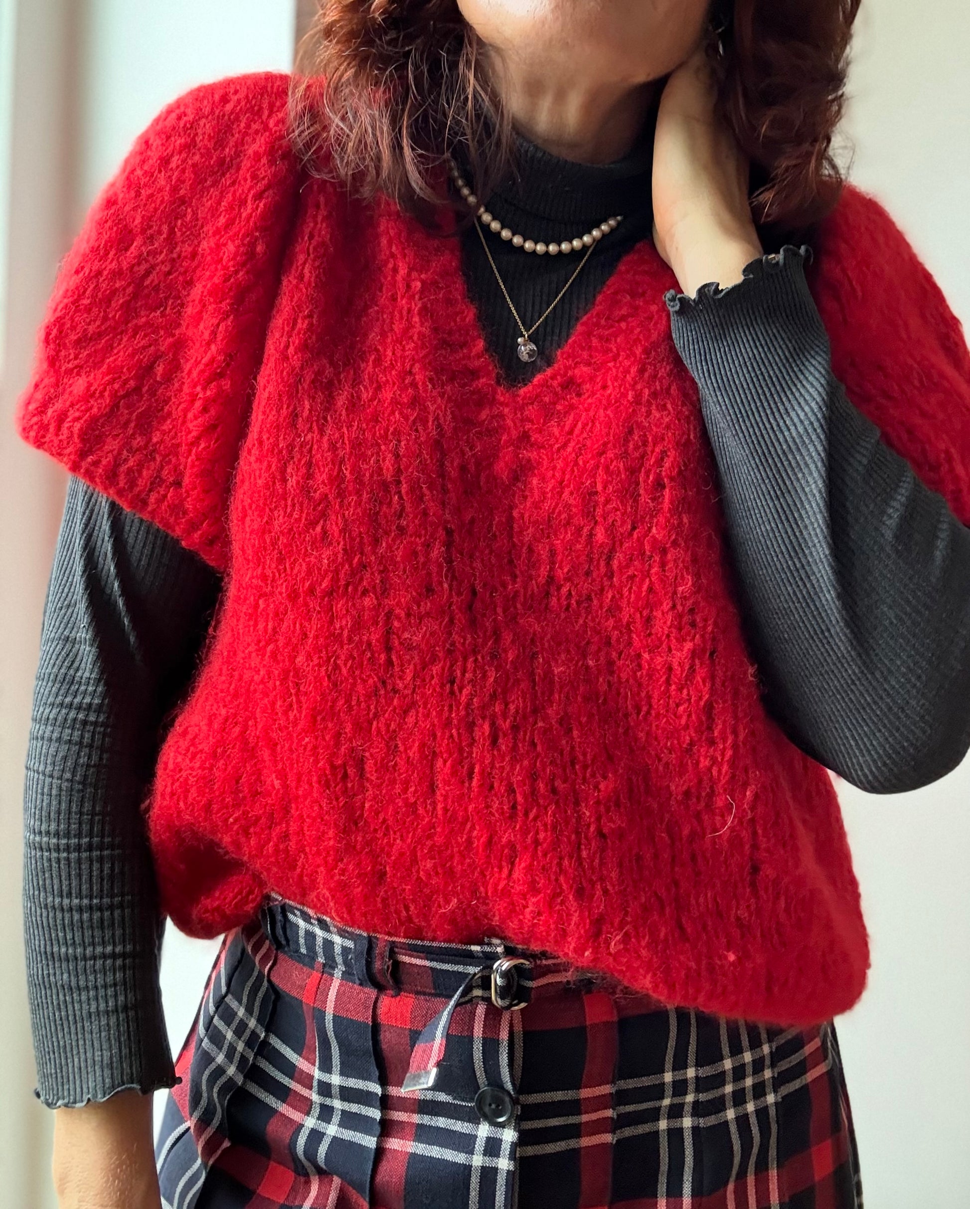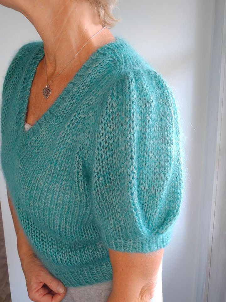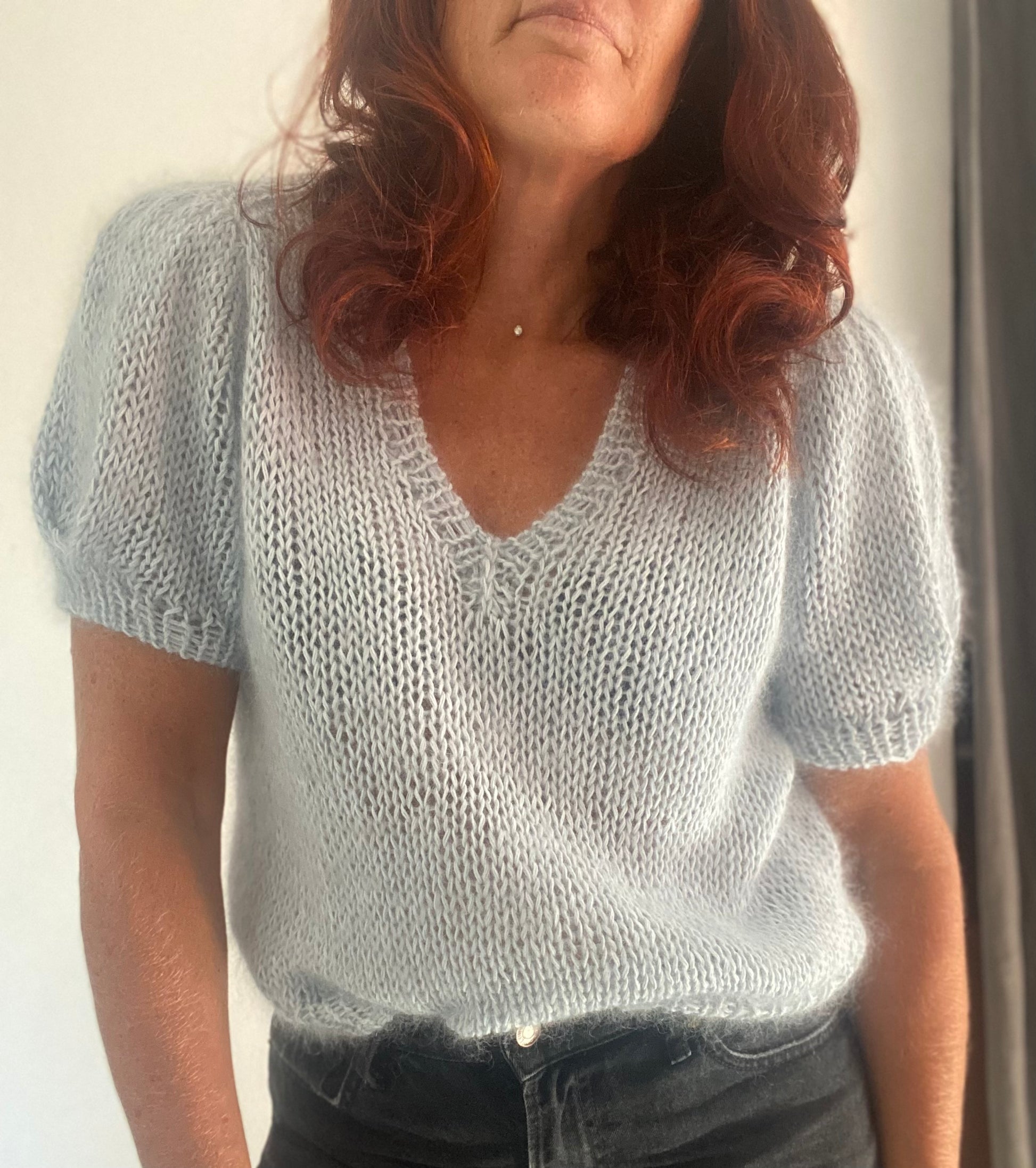 Mega Vibe Tee kan strikkes i 1 tråd mega mohair, så den bliver fluffy og varm. Eller i 4 tråde blandt hør, bomuld, silke og mohair. Herved bliver den mindre varm version.