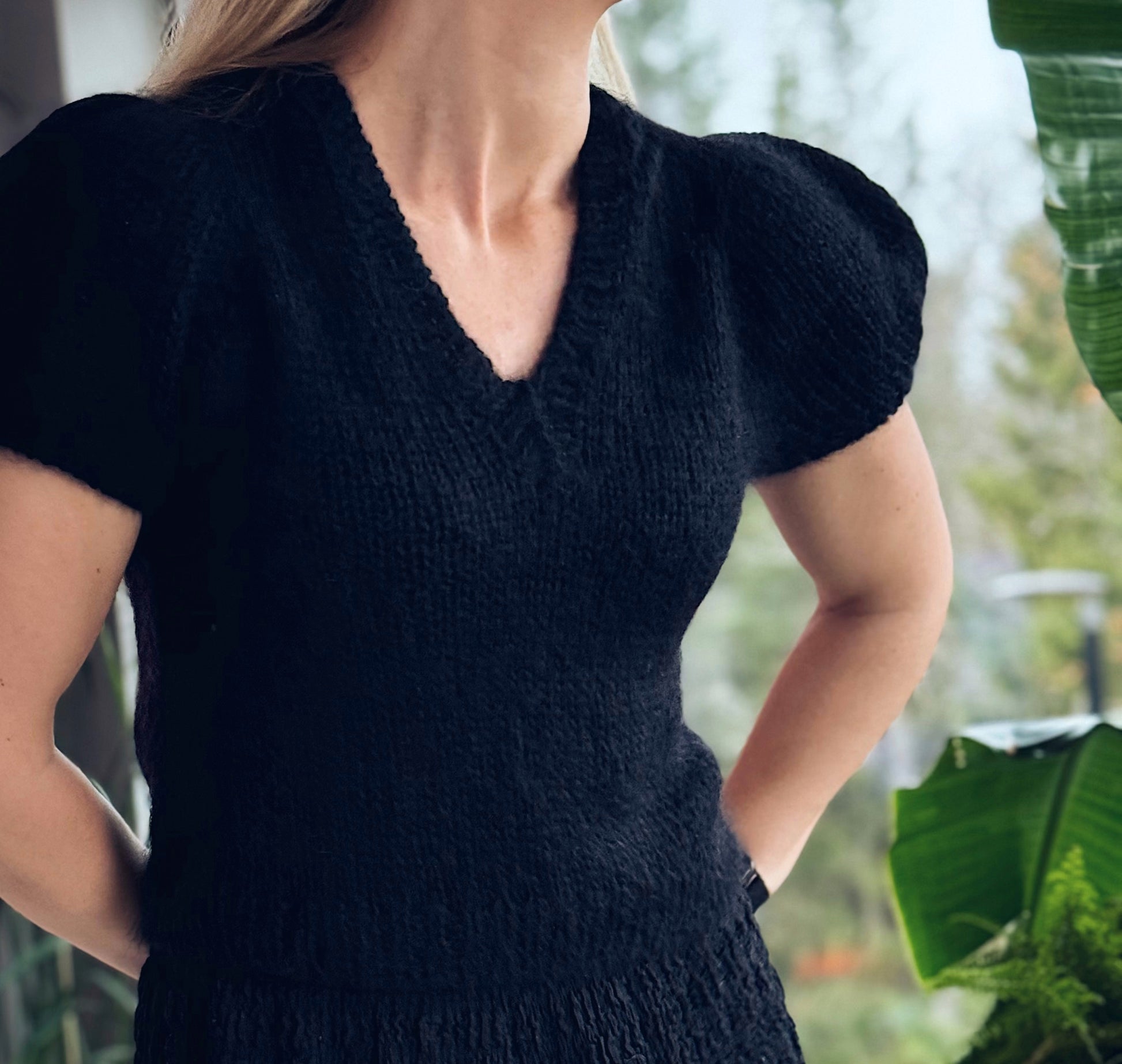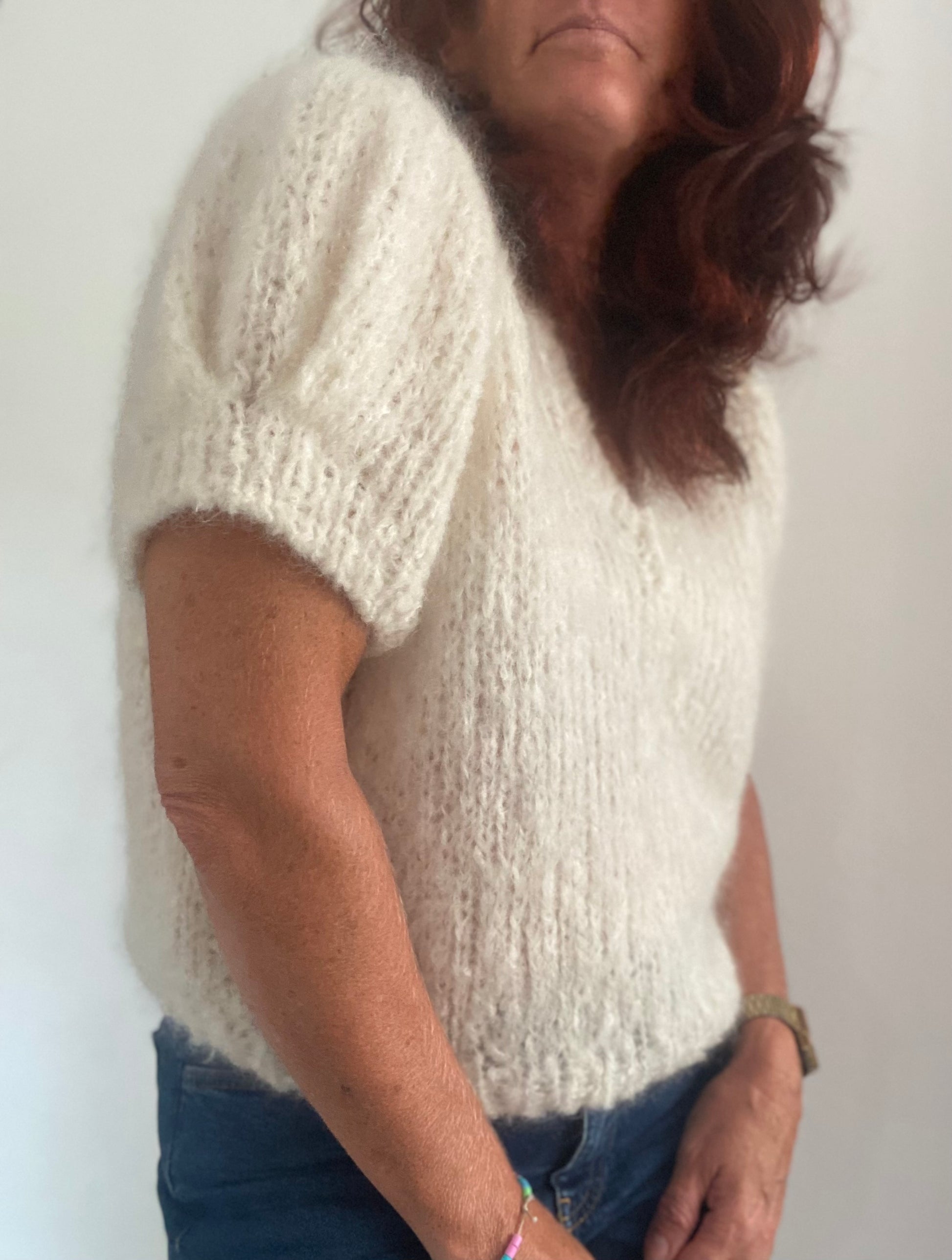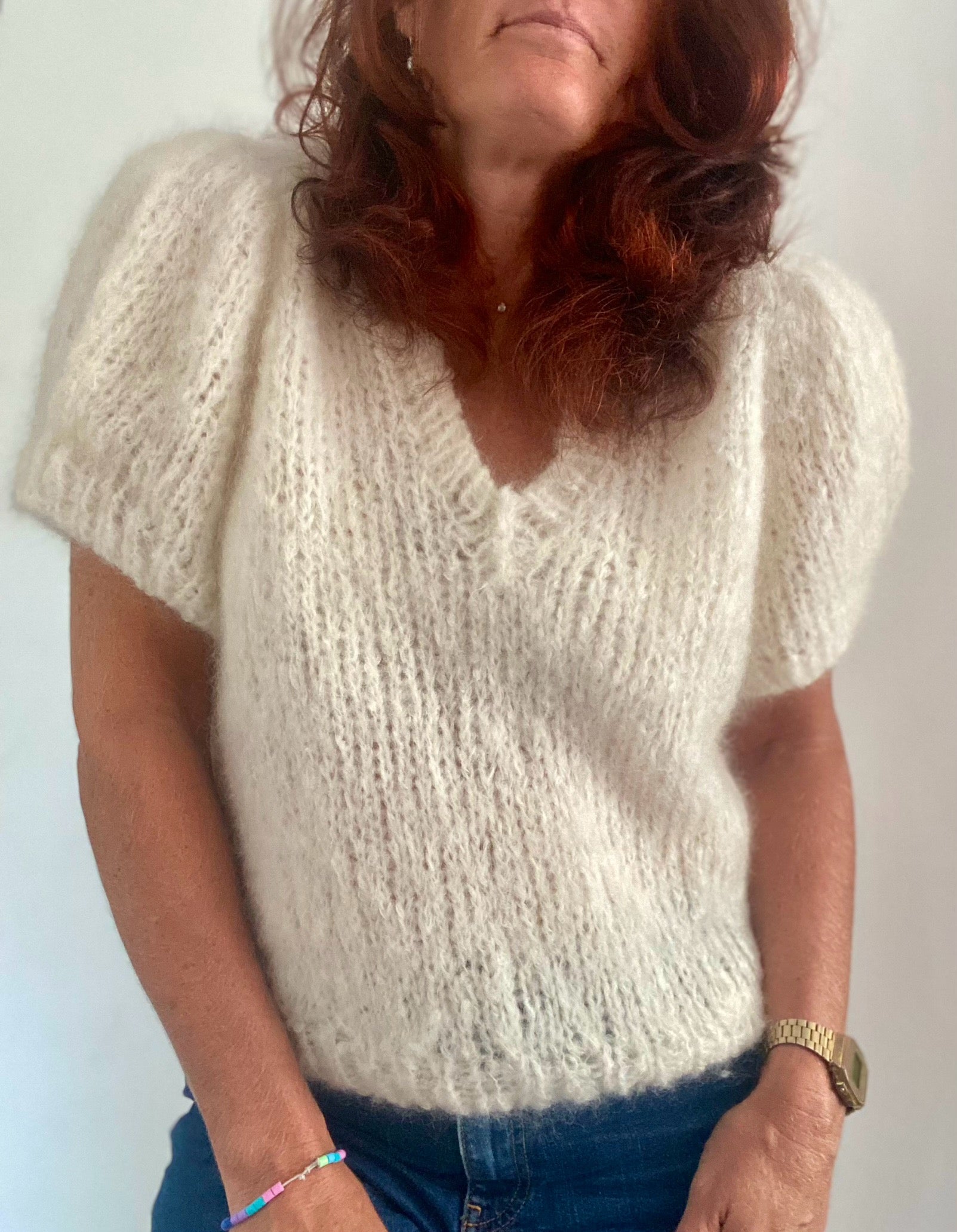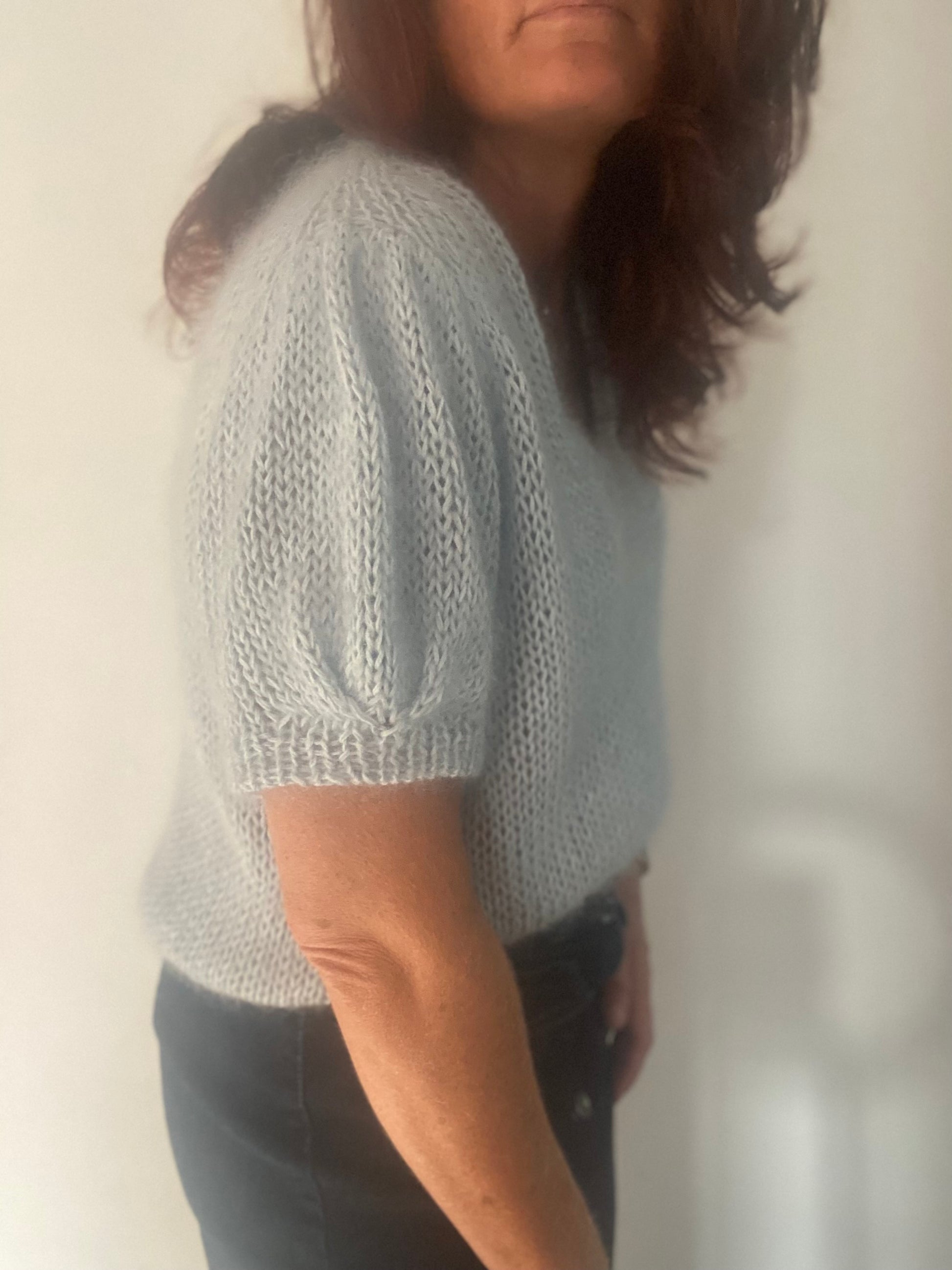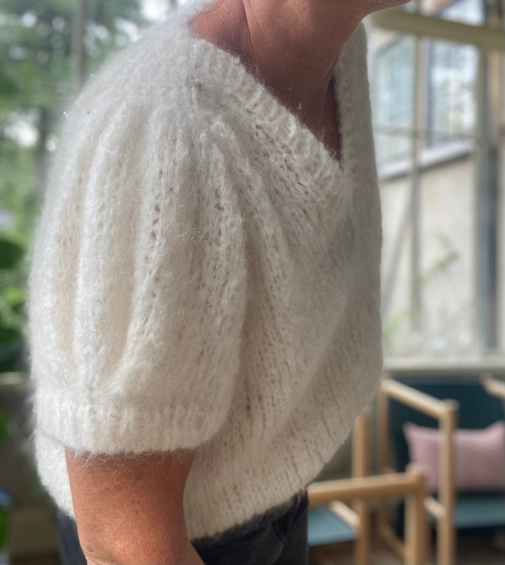 Beskrivelse af Mega Vibe Tee Mega Vibe Tee er strikket oppefra og ned i glatstrik med dobbeltstrikket saddelskulder og monteringsfri pufærmer. Dobbeltstrikken i skulderen sikrer, at puffet bliver siddende oven på skulderen og ikke glider ned. Efter bærestykket er strikket, deles til ærmer, hvorefter krop og ærmer strikkes færdige separat. Kroppen og ærmerne strikkes rundt i glatstrik.