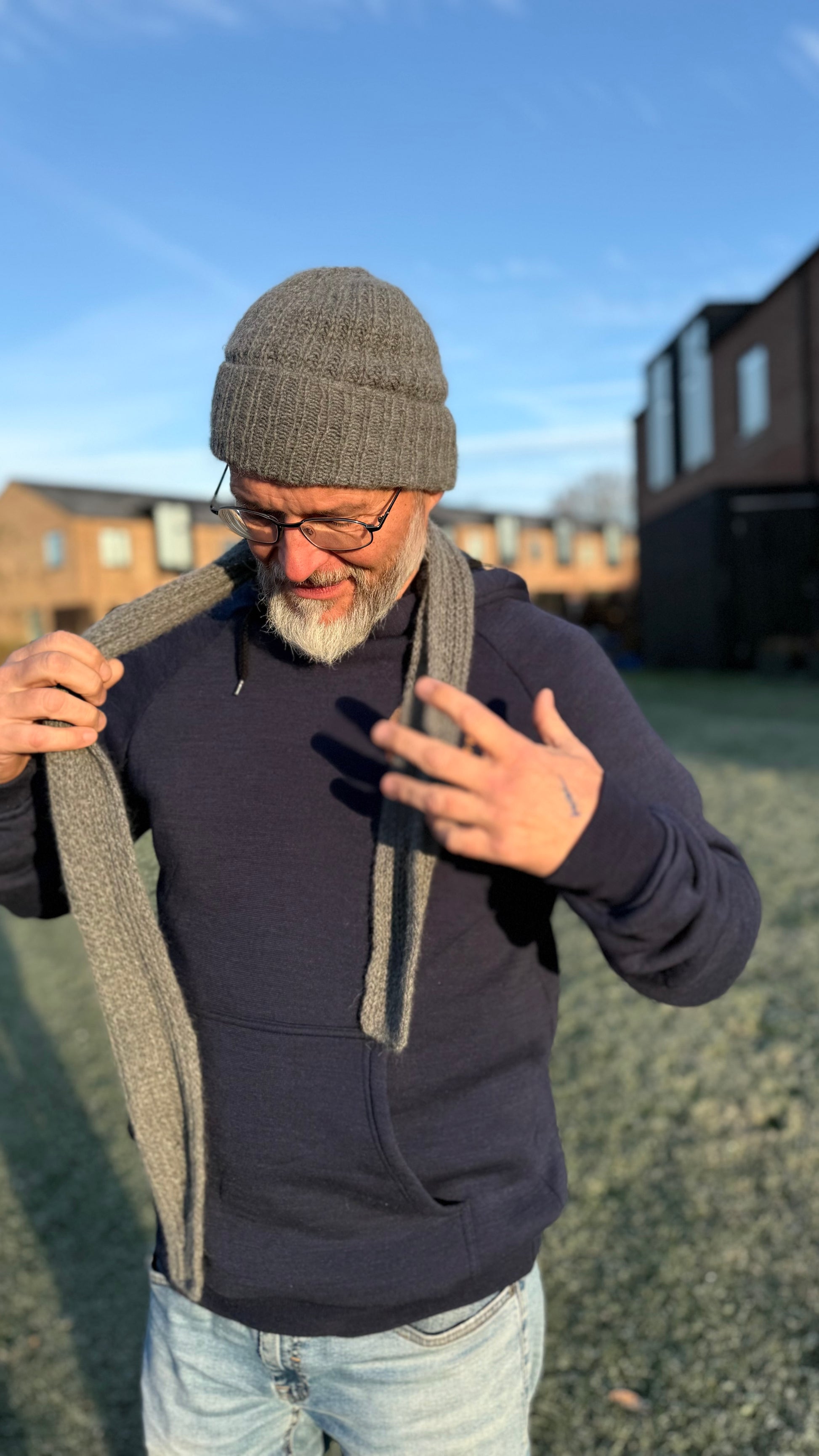 Billeder: Det vinrøde My Vibe Scarf er strikket i Cashmere Ekstra Lace Fra Lang Yarns i farven 266. Det grå tørklæde den unge mand har på er strikket i Double Kid Mohair fra Mohair by Canard. Det grå tørklæde, der passer til huen er strikket i Önling no 1. Huen hedder My Vibe Beanie. Det beige tørklæde er My Chunky Vibe Scarf.