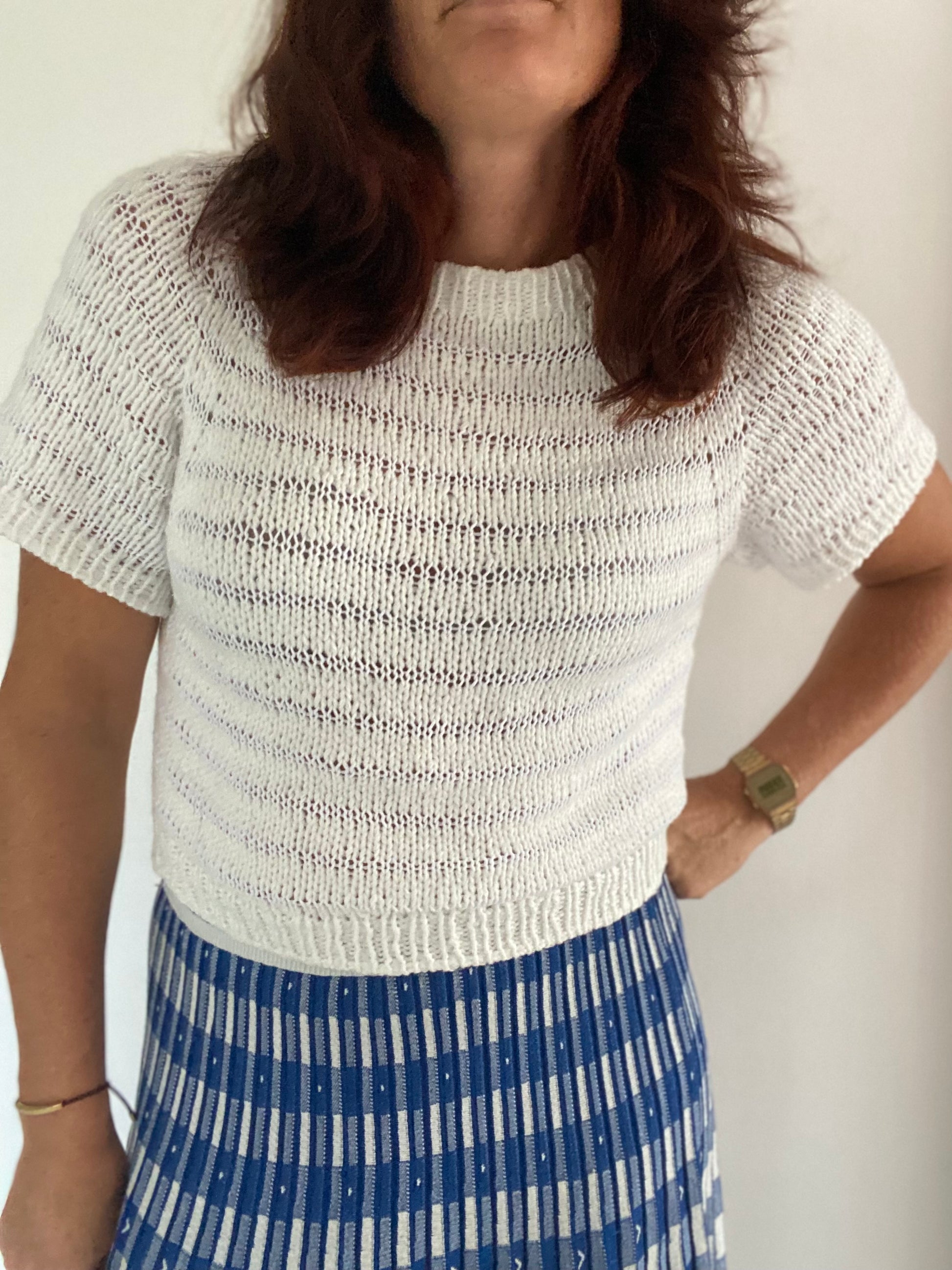 Beskrivelse af Striped Vibe Tee Striped Vibe Tee er en kort t-shirt, som er strikket oppefra og ned med raglanudtaginger. Nakken formes med vendepinde. T-shirten strikkes stribet med to forskellige garntyper; en tyk og en tynd kvalitet. Striberne med den tynde garnkvalitet er gennemsigtige. Efter bærestykket er strikket, opdeles til ærmer og krop, hvorefter kroppen og ærmerne strikkes separat. T-shirten afsluttes med ribkant. Ærmerne strikkes lige ned og afsluttes ligeledes med en ribkant.